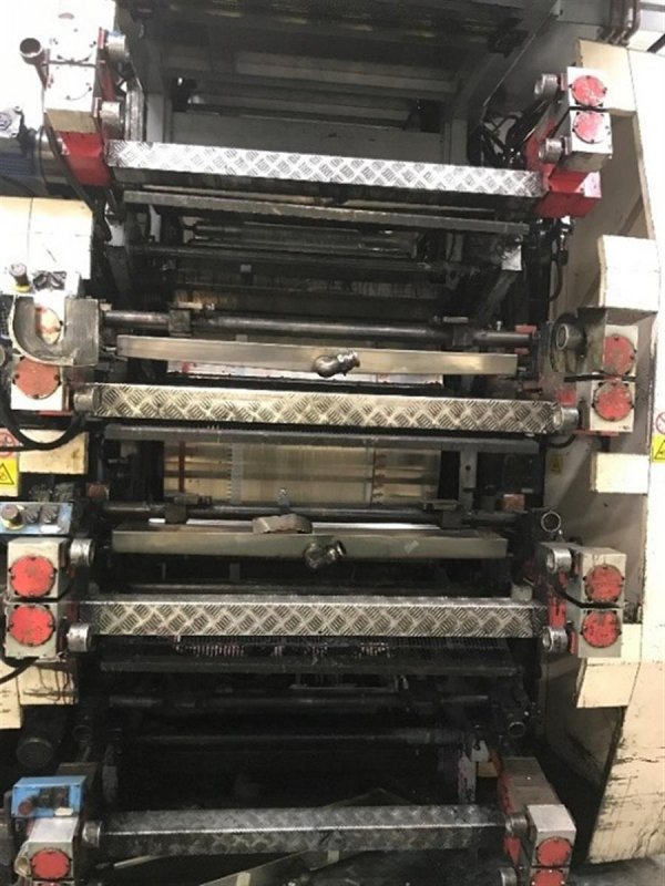 | Note | Substrates able to process:Plastic films Maximum speed :200 m./min. Bull-gear, pitch 5 mm. Edge guide systems:1 before printing and 1 before rewinding Length registers :Motorized remote controlled. Side registers:Manual. Decks’ positioning system:Automatic. Locking system of the printing units:Automatic. |
