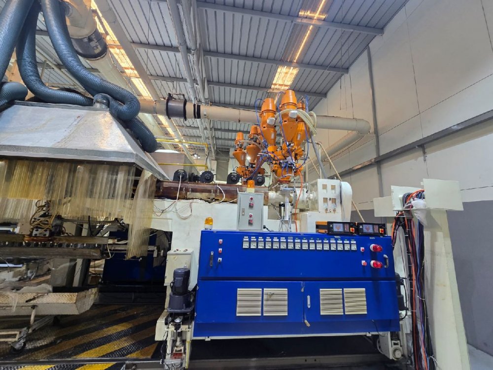 - Co- extrusion unit: A Extruder capacity 200 kg/h, screw ZB, G 90mm, L/D 35/1, heating zones - 6, mesh diameter 100mm, max. extrusion amount 260kg/h B Extrude capacity 70 kg/h, screw ZB, L/D 33/1, heating zones- 5, mesh diameter 80mm,max. extrusion amount 150kg/h feeding capacity: 400 kg/h Air gap height 80-150mm Die head: 3 layers distributor A/A/B; B/A/A; B/A/B; A/A/A Make : Sumitomo max. T-die Lip width - 1450mm Mould lip gap - 0.4-1.2mm Block type - Inside blocking Heating way - electricity Heating zones -11 Internal deckling system for width reduction. Final net coating width 600-1300mm 3 rollers lamination Chill roller diameter 700mm, chill roller length 1400mm,chiller roller mirror surface type, surface roughness RZ 0.5 Silicon rubber roller diameter - 255mm, Silicon rubber roller length 1400mm Supporting roller diameter 240mm, supporting roller length 140mm Peel Roller diameter 150mm, Peel roller length 1400mm, Siemens drive motor, warm reducer