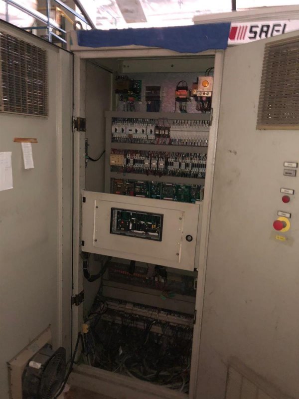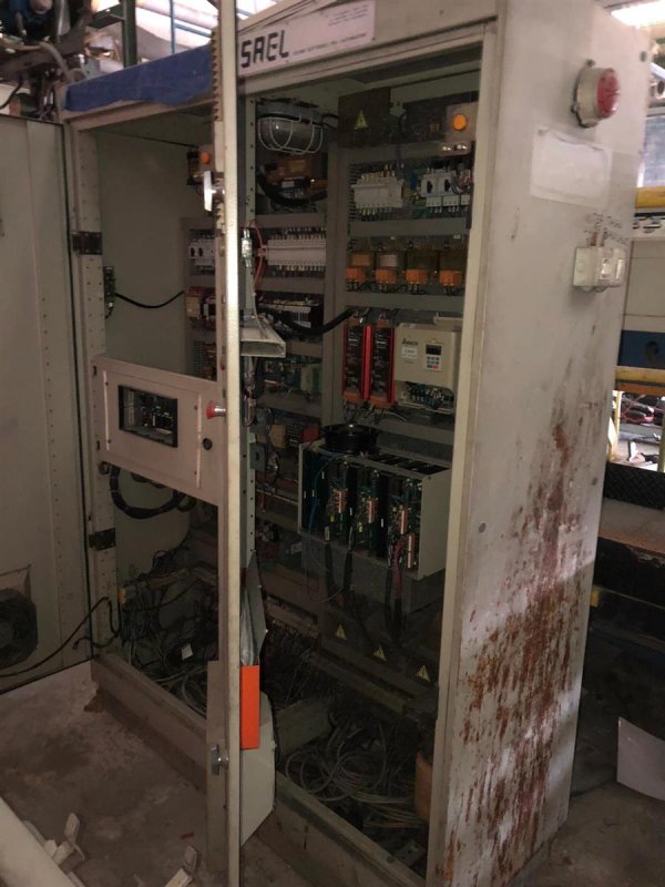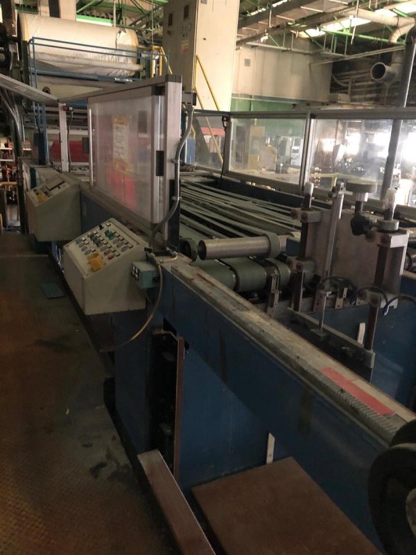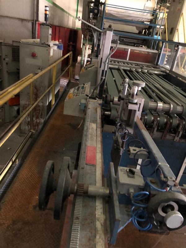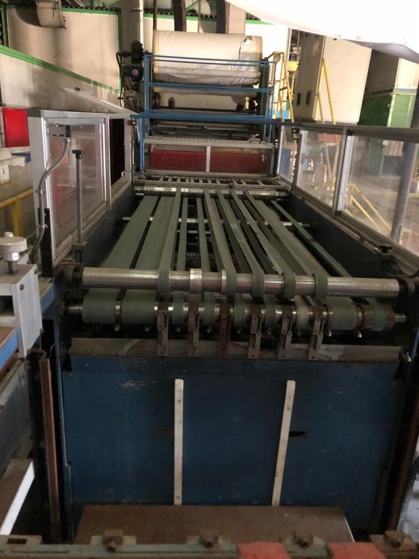 | Note | Pair of feeding cylinders, tension regulation through load cells, cutting equipment composed of fixed lower knife and rotating upper knife, transport unit composed of tow rollers and flat belts. Stacking on pantograph, which is continuously lowered, keeping the stacking level constant. Intermediate stacking equipment when changing pallets. Evacuation equipment for collecting waste in a box. Sheets: height 1.030-1.300 mm, length 850-1.580 mm, thickness 140 - 1.000 micron |