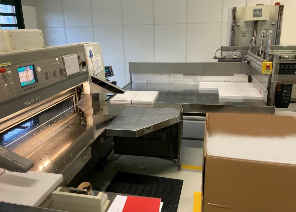 | Note | VLF sized Polar Mohr cutting Flowline with loading and unloading of the material to be cut consisting of Polar TR 185-BL-7 left-sided loading Transomat mit Chipmarker clamb gripper and slider for back table batching age 1999 sheet size 126 x 185 cm Gripper feed via rear table Cutter Polar 176 ED age 2000 - working width 176 cm - max. insertion depth 200cm - Insertion height 160 mm - transfer width between backside table and Transomat is 176 cm - Rotating and tilting saddle - with ED controller - left side pneumatic lowerable side bar - pneumatic lowerable stainless steel transfer corner on the right air table - approx 7 knifes Polar TR 160-ER-7 S on the right unloading Transomat age 1999 sheet size 126 x 164 cm Not included in delivery Floor-mounted Platform scale |