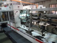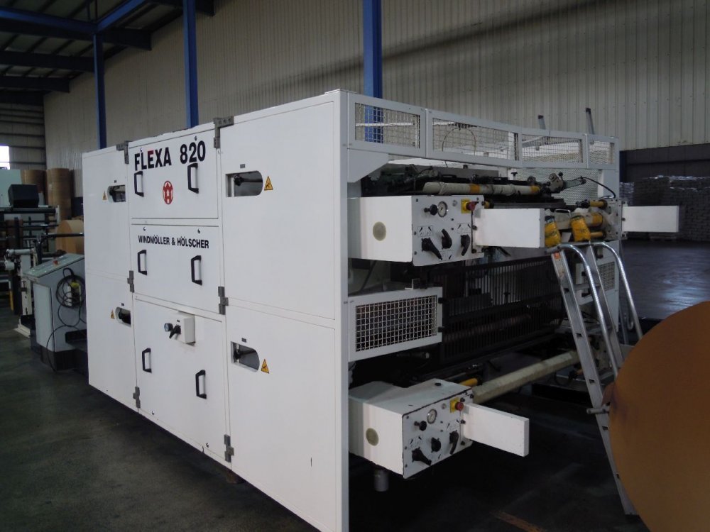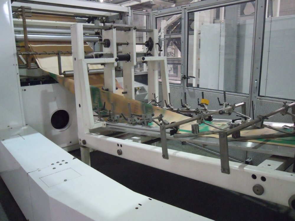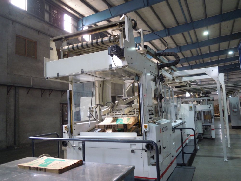 - Tail-End Printer Brand: W&H Model: FLEXA 820 Year: 2016 Web width: 1620 mm Printing width: 1320 mm Print repeat range: 450 – 1500 mm Max. mechanical speed: 350 m/min ( depends on materials, sack dimensions, etc.) Material: paper 40 – 250 gsm Ink: water-based Printing unit is designed for 4 color Electrical power (connected load): approx 20 kVA Frequency 50/60 Hz, voltage 3×400 V, without neutral Tuber Brand: W&H Model: AM 8115 CL Year: 2016 3 plies Stepped end and flush cut Min-max flat tube width: 260 – 600 mm Min-max cut-off length, stepped end: 380 – 1050 mm Min-max cut-off length, flush cut: 320 – 1050 mm Max roll width: 1230 mm Max roll diameter: 1300 mm Max. mechanical speed: 500 tubes/min Basic equipment of tuber: Unwinders – Shafted Version, Automatic web guide system, Web draws Perforating station Cross pasting, Register rollers, Seam pasting Tube forming section Flush-cut unit Belt tear-off section Packet forming station Main drive Weight of tuber without printer: approx. 34.000 kg Dimension of tuber: LxWxH approx 37 x 5 x 3,2 m TRANSYSTEM between Tuber AM 8115 CL and Bottomer AD 8300 Automated material flow system Sack width / tube width: 280 – 600 mm Sack length / tube length: 450 – 940 mm Bottomer Brand: W&H Model: AD 8300 Year: 2016 For the production of sacks with or without bottom patches With universal valve unit Min-max sack lengths stepped end: 410 – 740 mm Min-max sack lengths flush cut: 410 – 740 mm Min-max bottom widths stepped end: 90 – 140 mm Min-max bottom widths flush cut: 90 – 140 mm Min-max sack width: 320 – 550 mm Min-max width of opened bottom: 180 – 340 mm Min-max bottom center distance: 320 – 600 mm Tube lengths: 540 – 940 mm Max. mechanical speed: 360 sacks/min (depending on material quality, glue , sack size and operator qualification) Capacity produced per year: 100 Million standard cement sacks Basic equipment of bottomer: Rotary feeder, Main drive Register table Sack transport system Bottom creasing station Bottom opening station CCS geometry checking unit Bottom width creasing unit Bottom pasting station, Base frame for fixed size or variable bottom closing, Bottom edge pressing rolls, Base frame bottom patch units, Bottom turning unit, Sack transfer and reject gate, Motorized transverse adjustment Valve patch: Min-max cut-off length: 100 – 220 mm Min-max valve length: 100 – 220 mm Min-max roll width: 100 – 300 mm Bottom patch: Min-max cut-off length: 180 – 450 mm Min-max web width: 80 – 180 mm 1 x flexo bottom patch printer for one color 1 x flexo bottom patch printer for second color PCS print control system for automatic registering of bottom patch print in relation to the cut Required space for bottomer: LxWxH 22-28 x 5 x 2-4 m Power consumption: 65 kW Connected load: 400 V Control voltage: 24V DC Glue Preparation Plant