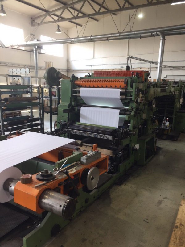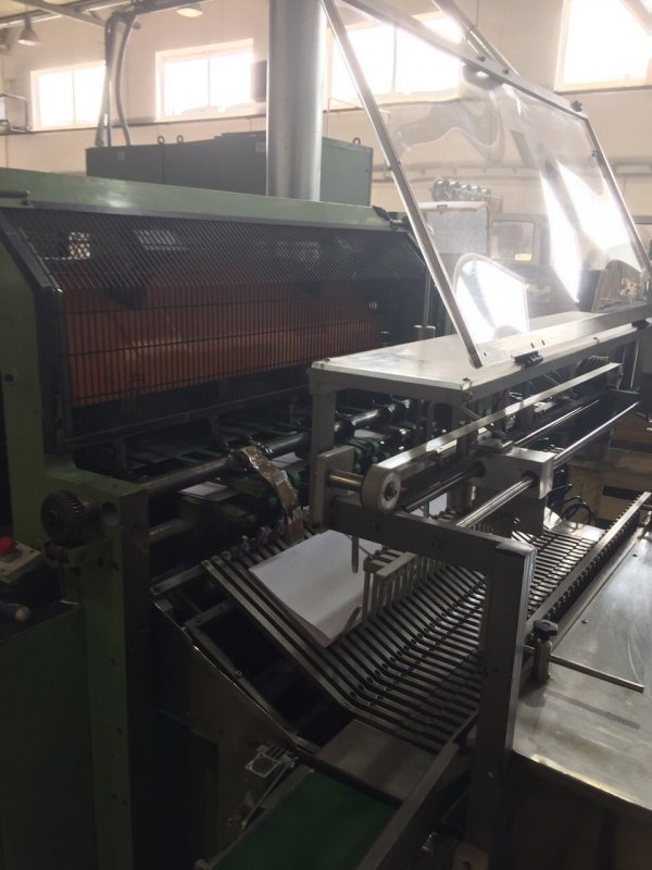 | Note | One real stand Diameter 1200mm max width 960mm 4 hole perforation Print 2/2 Cross cutter Counting and collecting Stitching unit Folder Square back press Long side cutting/short side cutting Max 60 stroke/ min From spare parts have gears for sheet count, knifes, stitching heads, printing cilindars. |
