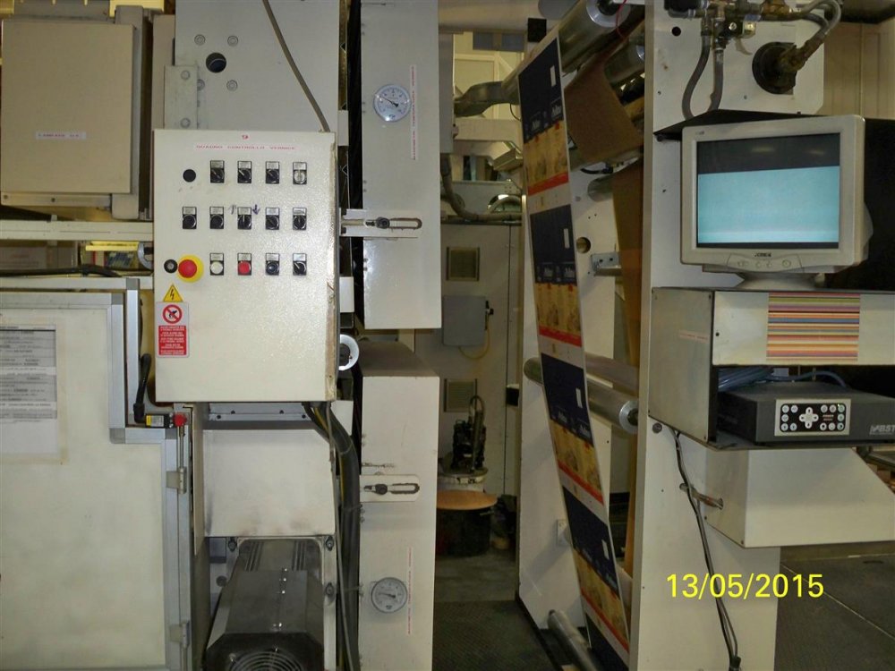| Note | Paper Registers motorized remote controlled Decks’ positioning system automatic with 4 motors per deck and job repeatability program Plate roller mandrels: 8 carbon fibre plate roller air mandrels diameter 108,342 mm. for the print section; 1 plate roller air mandrels diameter 89,243 mm. for the print section.9 print sleeves to choose among those on stock (only 9 as the rest will be kept by seller). 1 downstream printing unit (this unit is a geared type) for coating water based and UV varnish in register with the Central impression section (UV lamps offered apart). |