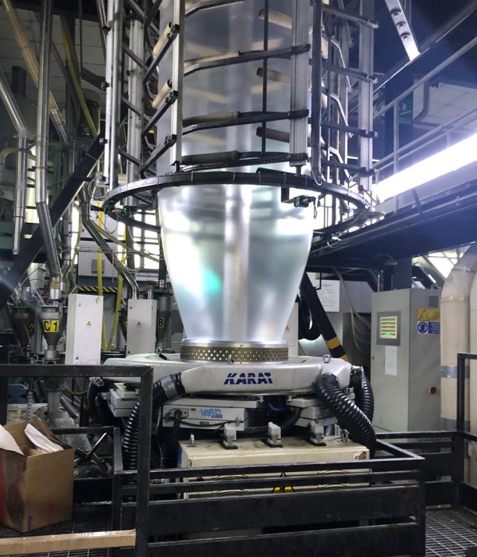 In a blown film extruder PE granulates (or other polymer) are melted in an extruder and pushed through a circular die extruding a tube of molten polymer. Tube is then inflated to multiples of its initial diameter and cooled to form a thin film. Bobble is later collapsed and re-winded.