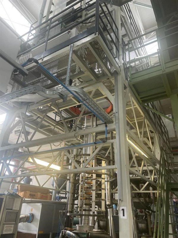 In a blown film extruder PE granulates (or other polymer) are melted in an extruder and pushed through a circular die extruding a tube of molten polymer. Tube is then inflated to multiples of its initial diameter and cooled to form a thin film. Bobble is later collapsed and re-winded.