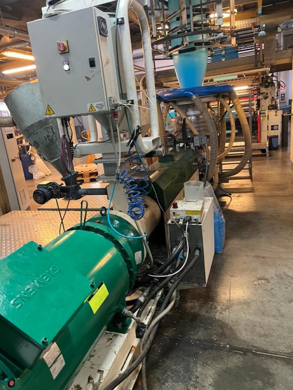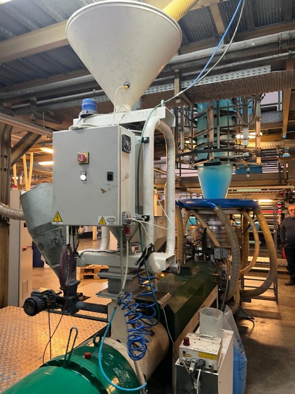 In a blown film extruder PE granulates (or other polymer) are melted in an extruder and pushed through a circular die extruding a tube of molten polymer. Tube is then inflated to multiples of its initial diameter and cooled to form a thin film. Bobble is later collapsed and re-winded.