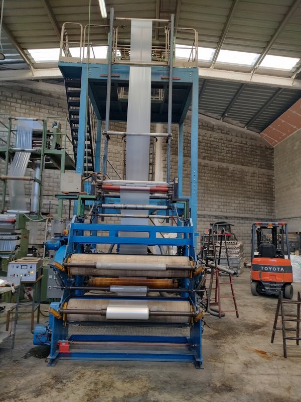 In a blown film extruder PE granulates (or other polymer) are melted in an extruder and pushed through a circular die extruding a tube of molten polymer. Tube is then inflated to multiples of its initial diameter and cooled to form a thin film. Bobble is later collapsed and re-winded.