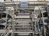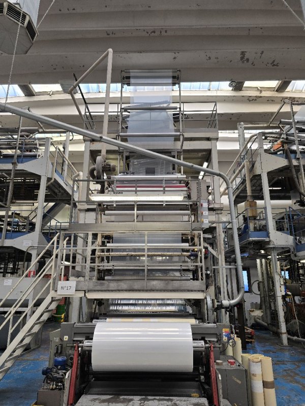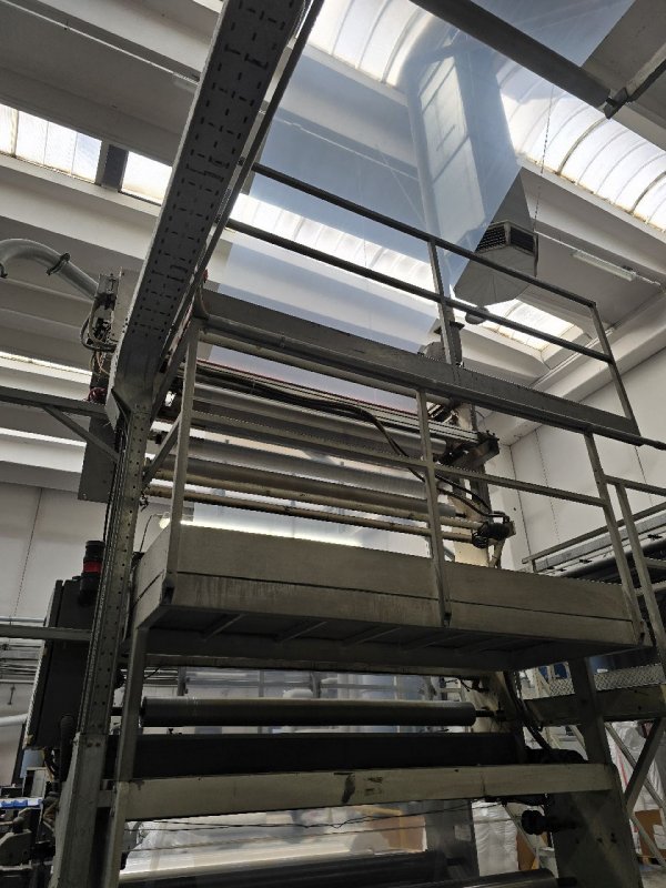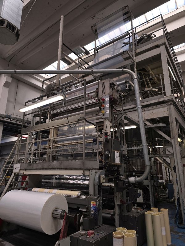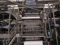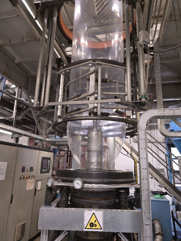 In a blown film extruder PE granulates (or other polymer) are melted in an extruder and pushed through a circular die extruding a tube of molten polymer. Tube is then inflated to multiples of its initial diameter and cooled to form a thin film. Bobble is later collapsed and re-winded.