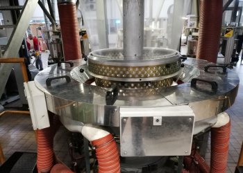 In a blown film extruder PE granulates (or other polymer) are melted in an extruder and pushed through a circular die extruding a tube of molten polymer. Tube is then inflated to multiples of its initial diameter and cooled to form a thin film. Bobble is later collapsed and re-winded.