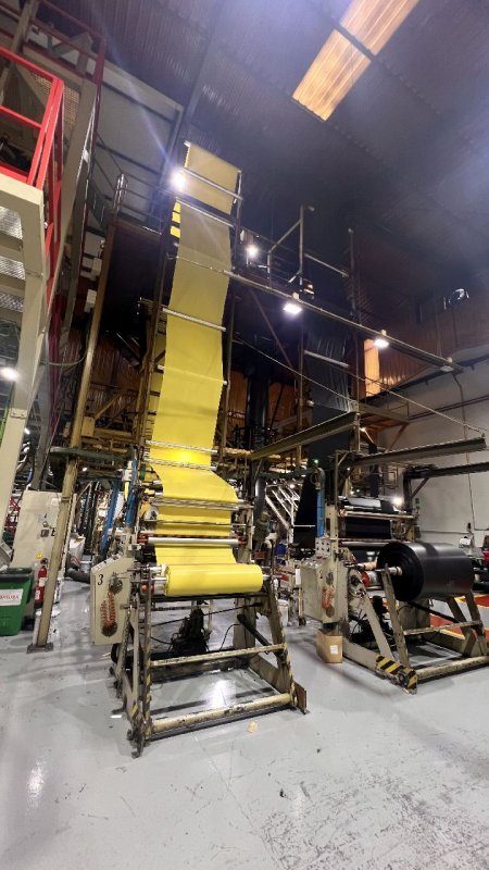 In a blown film extruder PE granulates (or other polymer) are melted in an extruder and pushed through a circular die extruding a tube of molten polymer. Tube is then inflated to multiples of its initial diameter and cooled to form a thin film. Bobble is later collapsed and re-winded.