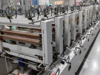 - Single, max reel width 1530mm, reel diam 1016mm 3 and 6 inch shafts, 2 trimming blades, edge guide, tension control, Punching station in register for guesset hole, main folding triagle for prodiction of 3 side seal from 1 web; Gusset foling bord for production of stand up from 1 web