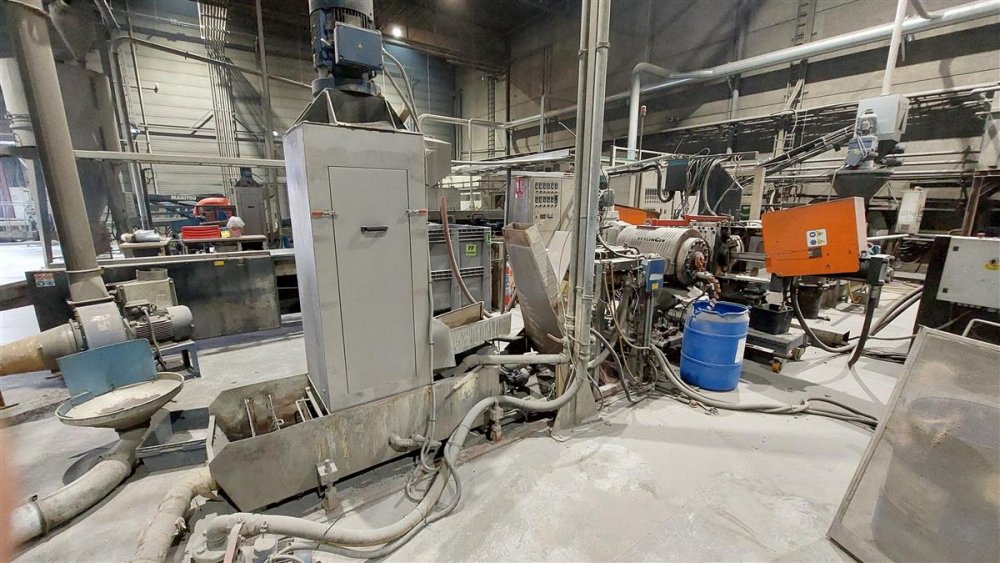 - One year warranty. To be refurbished in 2023. Delivery: 4 months from your order. Capacity: 1500 Kg/h TOTAL POWER INSTALLED: kw AVERAGE POWER USED: kw 300 - forced feeder system - dosing system for masterbatch - Extruder E160 LD37 with one venting zone - vacuum pump - control panel Forced feedeing system new A.C. main motor new AC 315 kW Main control panel new PLC Extruder Overhauled screw 2021 Blowers and heaters new Vent Pump new Vertical cut Overhauled no exchanger Control panel exchangers new Electric cables new