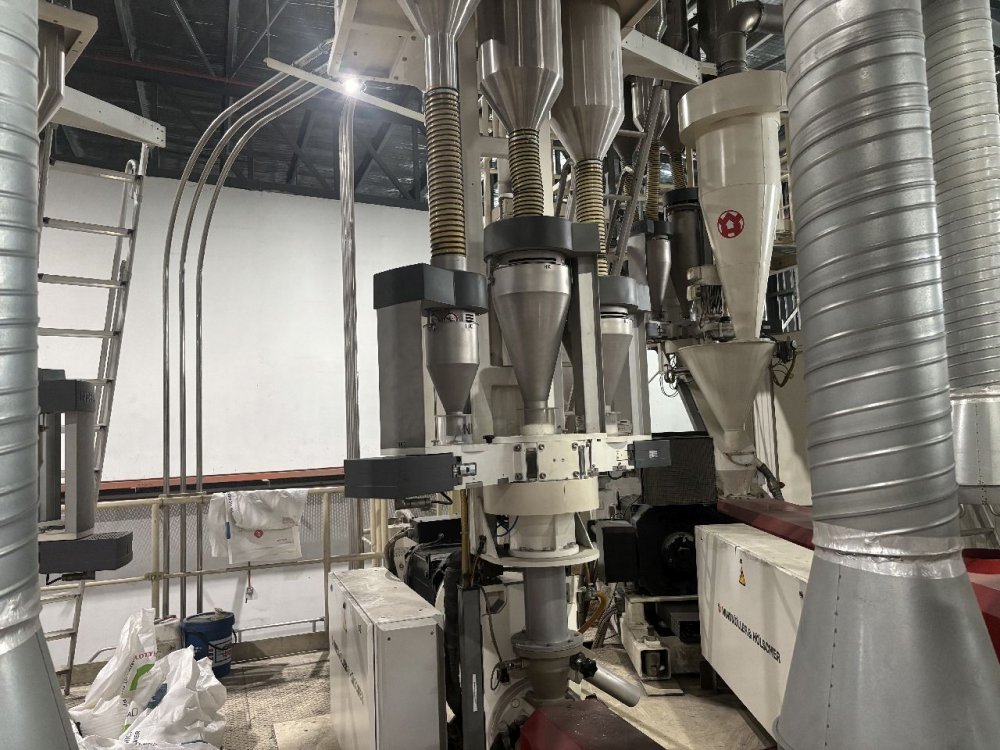 - - output 800 kg/h - 3 comp gravimetric dosing Module G3 with vacuum feeders - max screw rpm 165 - AC motor 370 kW - inverter controlled - Heating 75kW, air cooled + water cooling for feeding section - Bimetallic barrel and anti wear lining of feed barrel in tungsten carbide - Hydraulic screen changer - Pro control TS supervision