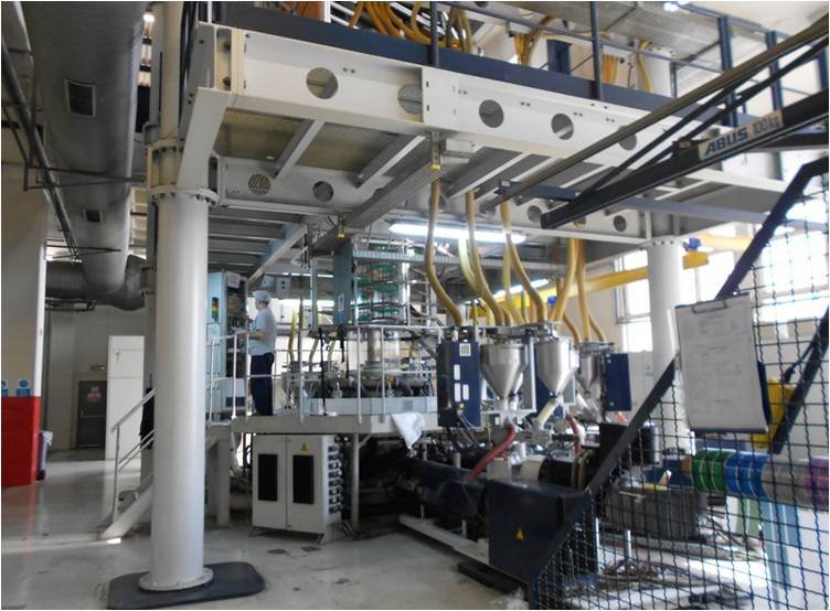 - - water cooled gear boxes with integral thrust bearings; heating/cooling combination with ceramic heating bands and blowers; material feeding with magnetic separator, flat side valve and level control; temperature control with heating circuit control/monitoring with wear-free solid state relays; AC Vector direct drives; - 3 Pivoting Screen Changer Type Kiefel for Kirion 50; 2 Pivoting screen changer type Kiefel for Kirion 60; 2 Pivoting Screen Changer Type Kiefel for Kirion 70; - 7 Melt Temperature Measurement Instruments; 7 Melt Pressure Measurement Instruments prior to screen changer with over-pressure interlock; 7 Melt pressure measurement instruments after screen changer; - 1 adapter; 3 Sound insulation plate for blower Kirion 50; 2 Sound insulation box Kirion 60; 2 Sound insulation box Kirion 70; 7 Heat Exchanger for Extruder Drive; - 1 Moveable Die cart; 1 preparation of Profile Control for the installation of heating cartdges in the centering ring or air ring; 1 Frequency Control for IBC supply and exhaust air blowers;1 IBC for low stalk production for die diameter 500mm; 1 High Capacity Air Ring HL 500/600; 1 Profile Control C2 equipped with 64 heating inserts for control of cooling ring air temperature with cooling ring HL 500/600;1 Air Ring Insert 500S dual lip Venturi insert for LLDPE/ lDPE low stalk production for die diameter 500mm;1 Extra Piping for blowes located on intermediate tower platform, operator controls located at floor level; 1 Twin Chiller; 1 Calibration Cage; - 1 Brush rolls with spread Effect 2200; 1 aluminium side guides 2200; 1 package for friction control; 1 Driven banana Spreader roll 2200; - 1 edge Fold Slitter 2200; 1 Edge Trim Slitting Station 2200; 1 Linear and Horizontal Blade Oscillation 2200; 2 Antistatic System; 2 Edge Trim and Multi-Web sliting Station; 4 additional twin blade holders; 2 horizontal oscillation; 4 pneumatic winding shaft; 2 winder control cabinet cooling device; 2 electric roll shaft hoists with frames; 1 edge trim guide fingers; Vacuum Suction System;1 Control of average Layer Thikness; - Accessories : Reversing haul--off, back to back winder; - Auxiliary Equipments : Corona Treater Softal (4-sided treatment);Electronic Systems Radiometric thickness control system; WaterBath for the Asymmetric Barrier Structures;Plastcontrol gravimetric dosing unit,running meter control, including material feeding.Gusset Boards for producing gusseted film; 1 main and 3 dosing components for the skin layers (Layer A&G), 1+2 dosing components for the core layers ( Layer B,C,D,E,F ). Thickness range: 20-250µ Thickness variation: +/- %5