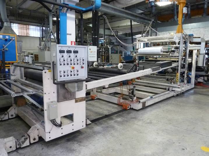 | Polishing stack/ calender lines unit | Sheet polishing unit VM 3 roll 1.800 mm ; 340 mm diameter, servo drive for each roll, hydraulic nip, motor nip adjustment.? Three reels 45° calender : Bending angle of 45 °, upper cylinder oscillating, cylinders hardened with 3 mm steel aisi 420, chrome, superfinite ( one spare cylinder + one epicicloydal gear reducer ) , Thermostatic pressurized water cylinders # 1 by three-way unit Sella maximum temperature 140 ° C ; ? Steel reels chassis to support the sheet out from calendering station : reels are made of steel having surface chrome hardened and superfinite and driven . Reels are feeded with thermostated water whose temperature is controlled thru unit pressurized water temperature control . A series of rubber covered rolls , having surface temperature controlled , follows the steel rolls : either steel and rubber rolls are assembled on a moving frame whose inclination can be varied accordingly ; |