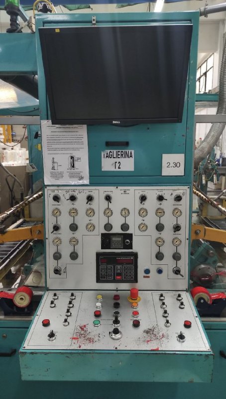 | Knives | 7 single circular blades with pneumatic insertion mounted on a crossbar with linear guide 1 Group of Multiple counter knife mounted on a motorized shaft (fixing dowels with Allen key tool) 1 Safety optical barrier (Laserscan) to stop machine when entering at production speed. 1 Safety optical barrier to stop machine when entering at production speed in the nip-rolls area New CUTTING System (DELSAR Lame) installed in 2022 with excellent and sharp cut and easy/quick set-up in job change-over |