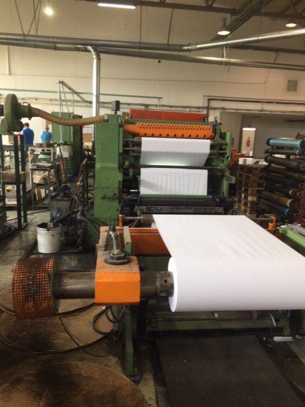 | Note | One real stand Diameter 1200mm max width 960mm 4 hole perforation Print 2/2 Cross cutter Counting and collecting Stitching unit Folder Square back press Long side cutting/short side cutting Max 60 stroke/ min From spare parts have gears for sheet count, knifes, stitching heads, printing cilindars. |