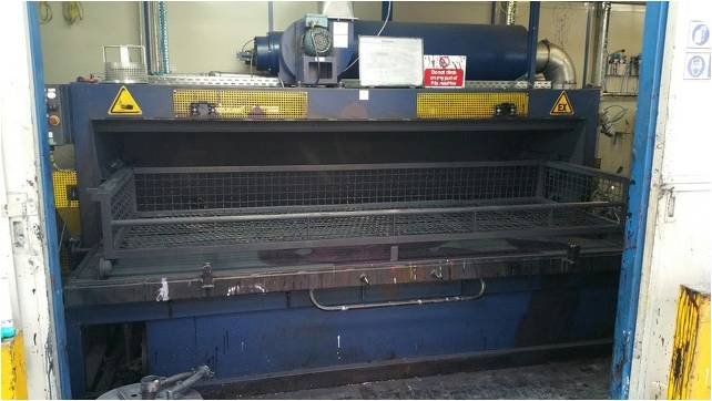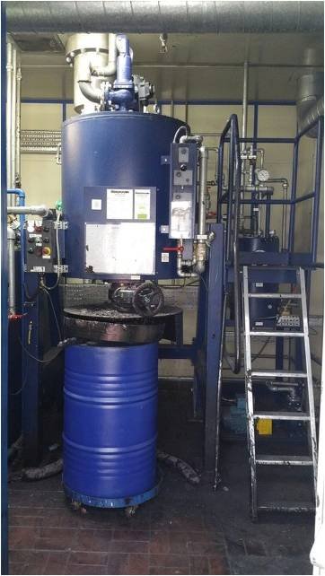 - Parts washer Renzmann type 340-27 Washing area 2500 x 900 x 500 mm ( w x d x h ) Explosion proof device, according to ATEX, for washing printing press parts with all common solvents . Front-loading washing machine with closed washing chamber and integrated separate solvent supply. Operating of machine is only possible with closed lift lid . Loading in removable strainer basket (stainless steel). Washing spray system with oscillating rotating spraying pipes. Fixed spray rinsing system. Heavy-duty washing pump/ex-motor unit. Removable filters for the protection of the spray system, the washing pump and the tubes. Filling level control for integrated solvent reservoir (operating level / maximum filling level). Inner exhaust with heavy-duty ventilator and pneumatically controlled air intake and air mix valves. Automatic washing program; including washing – dripping – rinsing – dripping – exhaust; all program steps can be selected individually DISTILLER TYPE ROTO 140 = having a vessel containing 400 ltr. The RENZMANN distillation units type ROTO recover contaminated solvents through batch distillation. The material to be distilled is filled into the distillation vessel in batch quantities or continuously. A rotating scraper system permanently cleans the heat transfer surfaces; thus it is possible to distil even highly contaminated solvents and waste inks, to reduce the residue to a large extent, and to discharge it automatically. The safety requirements for solvent distillation units are fulfilled, explosion-proof according Atex: category 1/2, explosion group IIB, temperature class T3. Filling capacity: approx. 140 l Vessel capacity: approx. 300 l Distillation output: approx. 30-60 l/h (depending on the solvent values may differ) Electric heating: 9 kW Basic version: Cylindrical, vacuum-tight distillation vessel, flanged lid, solvent-resistant coating . Pressure relief safety valve . Heating jacket with thermal oil as heat transfer medium, oil expansion tank with minimum-level switch LS22as safety against a lack of oil, thermostat TC23 for setting the heating temperature, additional temperature limiter, explosion-proof electric immersion heaters EEx-de installed in the heating jacket . Insulation of vessel, heating jacket and lid . Water-cooled condenser W21, temperature limiter TS21 switches off the heating or the supply of heat transfer medium if a set distillate temperature at the condensate outlet is exceeded due to a lack of cooling water The rotating scraper systemkeeps the heating surfaces largely free of residues and incrustations and agitates the vessel contents; it is driven by an explosion-proof motor via a worm gear; in case of overload, the system is shut off by a motor circuit breaker Soil-resistant sliding valve S22; after manual opening with the hand wheel, the residue is discharged through the scraper rotation The unit is mounted on sturdy supports, compact version to allow transportation through a 2000 mm x 1000 mm door; the residue can be discharged into a container of up to 650 mm height or into a wheeled residue container Sight glass and explosion-proof halogen lamp on the lid; the distillation process can be observed from the floor via a mirror Automatic systems included in the basic version: automatic filling stop triggered by a vibration limit switch (LS21) in combination with a pneumatic ball valve H25 in the filling line (valve closes in case of power failure); processing of the signals from the level indicators in the clean/used solvent containers (filling stop, heating shutoff). The temperature limiter TS22 shuts off the heating if the temperature of the solvent vapor exceeds a set maximum temperature. Control cabinet with operator controls and pilot lamps, to be installed outside the hazardous area Separate control box for the pneumatic system(maintenance of pneumatic elements can be performed without opening the control cabinet; electric components are not exposed to damp compressed air