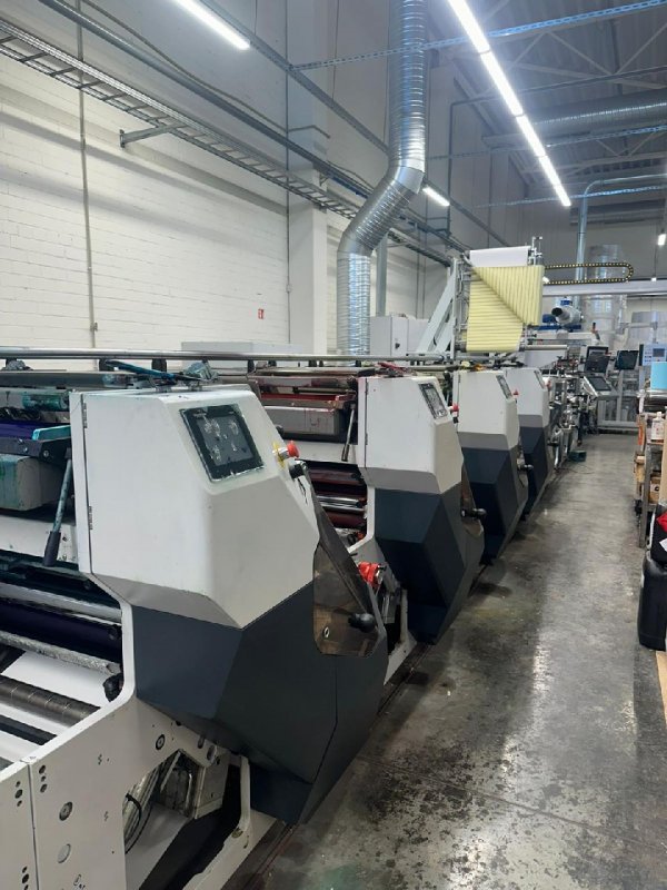 - 3 Flexo units and 4 offset units, 2 die cutting units. SHAFTLESS and GEARLESS Direct Drive flexo printing unit Side registration Servo Motorized; - Automatic Longitudinal and Transverse pre-registration, setting position Web turning bar, sliding on rail Antistatic bars Corona Treater Double side web cleaner 7 closed loop circuitc chilling system for chill drums. Automatic wash-up system for the offset inking train, complete with nozzles, washing detergents supply driven by electro-valves, liquid tank next to the relevant offset printing station, cleaning-roll doctor blade and solvent recycling tray. Printing Tooling (sleeve and cams) repeat: 99;104;128;134;144;146;149;153;156;157;160 Z;