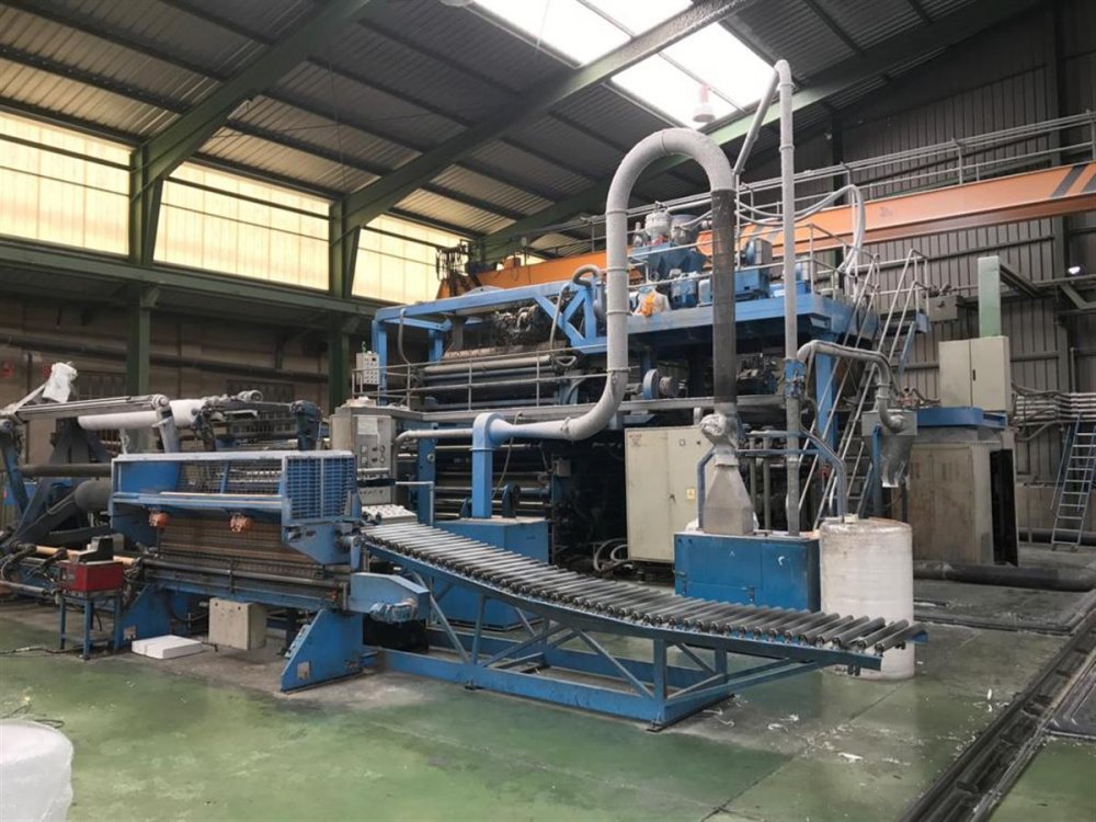 | Note | N.1 2-position unwinding group for third layer unit complete with disk braking with safety casing N.1 2-position unwinding group for fourth layer unit complete with disk braking with safety casing N.1 Bubble forming calender with cast cylinder and 2 preheating cylinders, vacuum suction pump with forming cylinder diam. 10x4 mm N.1 Chill roll unit with 2 cylinders diam 600 mm and 350 mm N.1 Air blade group N.1 Edge trim recovery system with suction heads, fan with ejector and sound proofing, sound proof mill with suction from grid, air-trim separation cyclone, motorised re-feeding extruder. • Power supply 380V 3-phase 50 Hz+N+G • Installed total power 760 Kw • Required water hardness 20°F • Compressed air quality dry • Compressed air pressure 8 bar |
