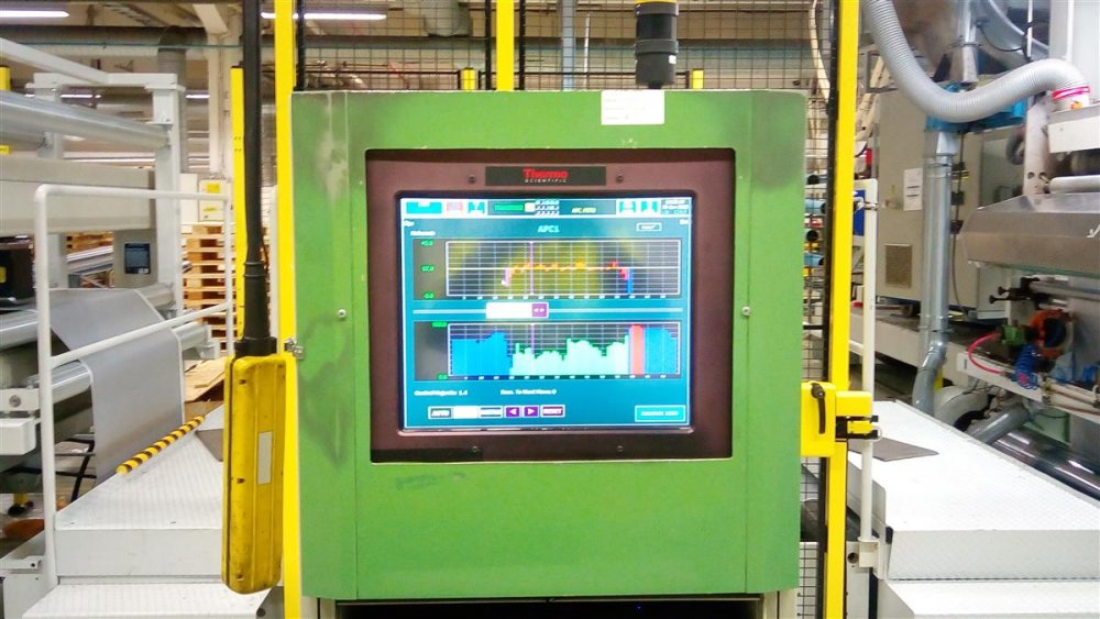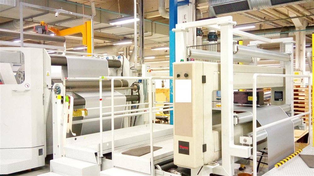- UPGRADES AND OVERHAULS: -Winder new in year 2015 - Controls upgraded year 2008, currently machine is PLC SIEMENS S7, dirves renovated with ABB inverters, Siemens Sinamics inverters and Eurotherm digital DC drives, Siemens HMI -Mechaical overhauls -Cloren automati extrusion die year 2014 (recently cleaned) -Spare cloren die year 2008 -Thickness control Themorficher year 2014 with 2 readng heads -Dosing and material feeding system year 2006 FILM THICKNESS CONTROLL SYSTEM: - Make Thermofischer - Year 2014 - Double gauge (o 1 frame) Beta ray system and infra red. SPARE PARTS: Extensive ste of spares. Among which including also: - Automatic extrusion head Cloren with internal deckling - 3 x chill rollers (2 with mat finish, 1 with gloss finish) All with new finish - 4 new nip rollers for second ECL unit - banana roller - cooling roller - Other 4 new + 3 used rollers - 1x vetafone unit - pneumatic pipe’s roller for first ECL unit - contact woller (for winder) - set of new gears to change rpm ratios on extruder’s gearbox - 4x rotary joints - several new and used heaters for extruders - 2 new double fans for extruder’s cooling - sets of roller bearings (for calander) - second extrusion die’s feedblock cassettes for structures: ABA, AAB, BAA, AAA, BBB - several melt temperature and preassure gauges - several spares for die, including several spare thermo cylinders - new motors - 2 new Siemens Simoreg DC drives - Spares for carrige, e.g.: wheels, chain for pipes - Several new and used pnaumetic pistons used in different parts og the line (including ECL units and winders - several rollers