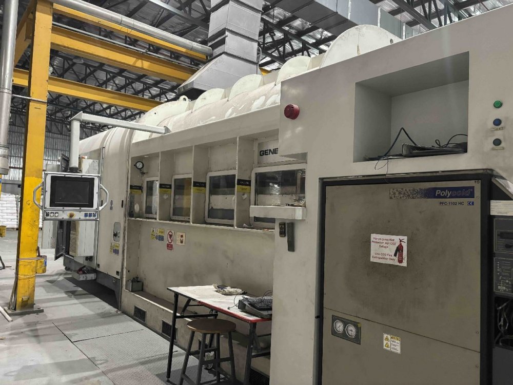 - Highlights: - Camera and monitoring system - Portholes circular viewing - Closed loop automatic deposition control - Closed loop tension control - End tensioned evaporator clamping - Precision zones seals - Full width viewing windows - MFC Gas wedge injection system - Individual stepper motor control - Individual temp control - Individual Trystor control - Integrated drum shield and shutter - Inverter controlled booster pumps - Linear tracking anti-telescoping lay-arms - Multi point deposition monitor - Remotely adjustable bowed spread roller - Edge shield adjustment - Same side reel change over - Swing over clamps - Web system control interface Web tension 66-662N Anti telescopio via 2 linear tracking lay arms Cooling: - Process drum: 595mm diam chrome plated - 2 zone gas wedge injection system, layer of gas between process roll and web -1x post coating cooled roller 250 mm diam Spreading: - 1x spiral grooved roll - 3x bowed spread er rollers Tension : - 2x load cell rolls to measure tension on unwind and rewind - 1x Independently driven draw roller, with high friction covering, to tension web over process roll Optical system with light emitting diodes and photo detectors for O.D monitoring Chiller