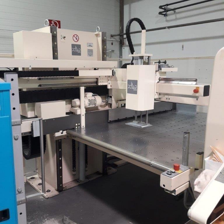 - - working depth 202,5 cm - transfer width between backside table and Transomat is 176 cm - with ED controller - left side pneumatic lowerable side bar - pneumatic lowerable stainless steel transfer corner on the right air table -approx 12 knifes Left-sided loading Transomat mit clamb gripper and slider for back table batching Polar TR 185-BL-7