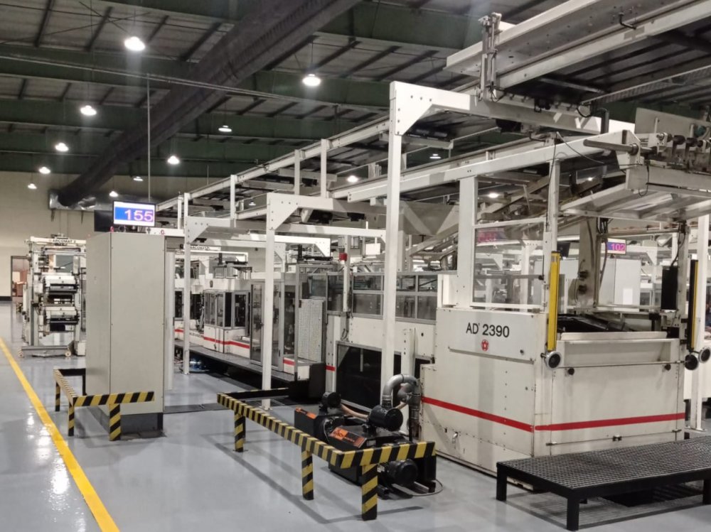 - TUBER Brand: W&H Model: AM 2185 Year: 2006 Plies 4 Stepped end and flush cut Min-max tube width: 260 – 500 mm Min tube length stepped end: 480 mm Min-max tube length flush cut: 450 – 850 mm Max paper roll width: 1030 mm Max paper roll diameter: 1350 mm Number of unwind stands: min 4 Core i.d.: 76 mm Output: 350 tubes/min. The owner makes 250 tubes/min. Max web speed: 300 m/min Photocell for PCS Rated power: approx. 80 kW (without printer) Power characteristics: 400V, 50Hz without neutral Required space: (4-ply machine): according to layout plan BOTTOMER ( with valve unit ) Brand: W&H Model: AD 2390 Year: 2006 Type of valve: Two valve types are produced by the owner – flat and tubular. The valve with PE liner is not possible to produce Min-max tube lengths: 540 -940 mm Min-max tube width: 320 – 550 mm Min-max sack length (stepped end and flush cut): 410 – 740 mm Min-max sack width: 320 – 550 mm Bottom center distance: 320 – 600 mm Bottom : For stepped-end sacks: 90 – 140 mm (valid for 3-ply stepped end sack) For flush-cut sacks: 90 – 140 mm Min-max valve length: 100 – 220 mm Min-max valve cut-off length: 100 – 220 mm Min-max roll width: 100 – 300 mm There is a bottom patch but the owner doesn’t use because not requirement by the customers With printer for bottom patch 2 colors Printing cylinders: 2×280, 2×330, 2×380, 2×420, 2×520 mm Bottom cap: (option available against extra charge) Min-max cut-off length: 180 – 450 mm Min-max roll width: 80 – 180 mm Output: with 2-drum delivery maximum 300 sacks/min (depending on raw material quality, product design and operator qualification).The owner makes 230 sacks/min Packet frequency: with 2-drum delivery maximum 25 sacks/min Capacity: up to 200.000 sacks/per day, 60 million sacks/per year Glue preparation plant is not included Required space: according to the layout plan Power consumption: 35-40 kW Rated output of drive: 25 kW Connected load: 400 V Weight: without bottom cap unit ca. 17.000 kg,with bottom cap unit: ca. 20.000 kg IN -LINE PRINTER Brand: W&H Model: Flexa 820 Year: 2006 4 color; currently equipped with 2 printing decks Web width: 1370 mm Printing width: 1320 mm Print repeat range: 450 – 1500 mm Output speed when equipped with fountain roller inking system: max. 250 m/min (depending on job specification and print related factors) Materials: paper 40 – 250 gsm Water based inks Printing cylinders: 8×720, 7×730, 8×740, 7×750, 7×760 mm Required space: per W&H installation drawing Power consumption: 50 Hz 3×400 volts, without neutral W&H Transystem 1 with software SIMATIC S7-300 of SIEMENS PALLETIZER Brand: W&H Model: Arcomat 2 Year: 2006 Min-max sacks length: 250 – 1400 mm Min-max sacks width: 180-750 mm Pallet dimensions (per W&H-pallets specification): Min. 600×750 mm, max. 1400×1500 mm Min-max empty pallet height: 100 – 180 mm Palletizing surface: min 600×600 mm, max 1500×1600 mm Max packet height: not compressed 180 mm, compressed 80 mm Max empty pallet stack height: 1400 mm Max stacking height: 2500 mm Max stack weight: 1500 kg Min-max working range of pallet press: 850 – 2500 mm Stack pressing force: appr. N 10.000 Height of outfeed conveyor: 300 mm Max output: 25 packets/min (The indicated output relates to a maximum packet height of 8 cm, to a maximum sack width of 50 cm and a minimum of 6 packets per layer on the slide table. Output may be reduced when handling products differing from the above specifications, when handling bags with smooth surfaces, or when pallets are changed) Connected load: 43 kWa