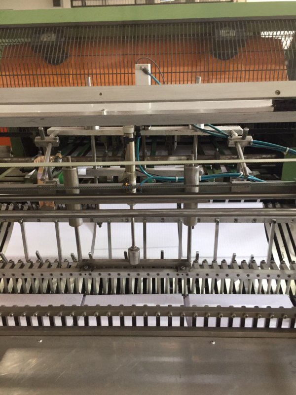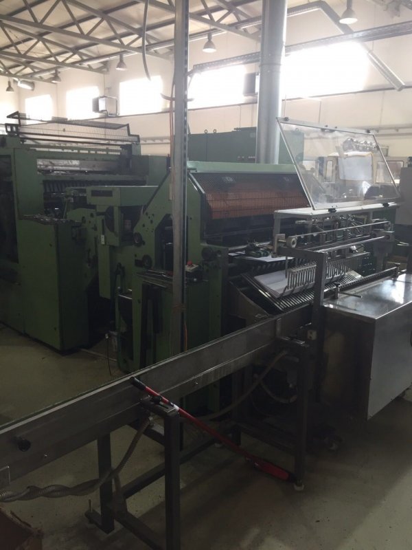 | Note | One real stand Diameter 1200mm max width 960mm 4 hole perforation Print 2/2 Cross cutter Counting and collecting Stitching unit Folder Square back press Long side cutting/short side cutting Max 60 stroke/ min From spare parts have gears for sheet count, knifes, stitching heads, printing cilindars. |