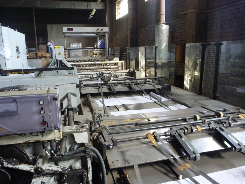 - Product: wire stitched books Basis weight: 55-300gsm Working speed: 500m/min Shaftless unwind stand x 1, 76mm core Reel diameter: maximum 1524mm, minimum 550mm Reel width: maximum 1205mm Flexo ruling tower: Two colour each side of web Print repeat range: 270-720mm Maximum web width: 1120mm Anti static device Cross cutter section: Maximum web width 1130mm Cuts 1600 per minute Cutting length 180-765mm Collecting section: Sheet fed cover feeder: maximum cardboard weight 1000gsm Roll fed cover feeder: web width 185-720mm, core 76mm, 120 cuts per minute One colour flexo printing unit for covers Finishing section: 100cycles/min, 10 stitching heads Cutting section: Minimum size width 130mm Waste exhaust: maximum distance 40m Corner rounding: radius 12mm Waste exhaust Turning of products Collecting of stacks: minimum 100 x 100mm, maximum 400 x 400mm, 100cycles/min Accumulation delivery