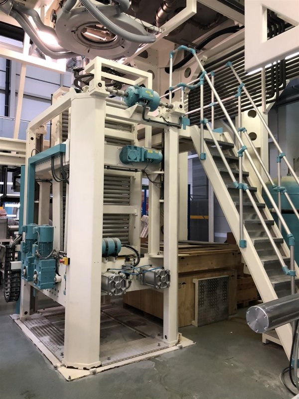 | Ulteriori informazioni | Stretching: - preforming unit gage insert 1 set -1st pulling unit max speed 40m/min: for pulling and tension control - Preheating exchange length 3m - 2nd pulling unit max speed 40m/min: Squeezing the film tube, 2 squeezing rollers - Cooling ring for process stabilizing after preheating and pulling (including heat exchanger) - Cooling ring for cooling (including heat exchanger) -3rd pulling unit max speed 100m/min: to pull tubular, Reversing device and air reversing layers Reverse speed infinitely adjustable, Electric height level adjustment Adjustment range 2m - Width gauge - Humidification pool - Blowing off - 4th Pulling unit max speed 100m/min: to pull material from unit 3, and to guide material into post-treatment unit - Post treatment - Corona treatment - Dancing roller - Width gauge Dosing system: - 5 x gravimetric dosing units 3 components for extruders A/C/E/G/I - 4 x gravimetric dosing units 3 components for extruders B/D/F/H Material suction system Thermoregulation units |