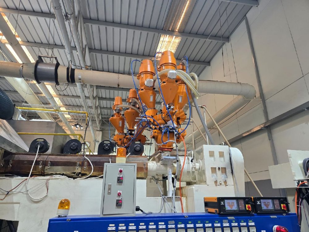 | Unita di spalmatura / accoppiamento 2 | Co- extrusion unit: A Extruder capacity 200 kg/h, screw ZB, G 90mm, L/D 35/1, heating zones - 6, mesh diameter 100mm, max. extrusion amount 260kg/h B Extrude capacity 70 kg/h, screw ZB, L/D 33/1, heating zones- 5, mesh diameter 80mm,max. extrusion amount 150kg/h feeding capacity: 400 kg/h Air gap height 80-150mm Die head: 3 layers distributor A/A/B; B/A/A; B/A/B; A/A/A Make : Sumitomo max. T-die Lip width - 1450mm Mould lip gap - 0.4-1.2mm Block type - Inside blocking Heating way - electricity Heating zones -11 Internal deckling system for width reduction. Final net coating width 600-1300mm 3 rollers lamination Chill roller diameter 700mm, chill roller length 1400mm,chiller roller mirror surface type, surface roughness RZ 0.5 Silicon rubber roller diameter - 255mm, Silicon rubber roller length 1400mm Supporting roller diameter 240mm, supporting roller length 140mm Peel Roller diameter 150mm, Peel roller length 1400mm, Siemens drive motor, warm reducer |