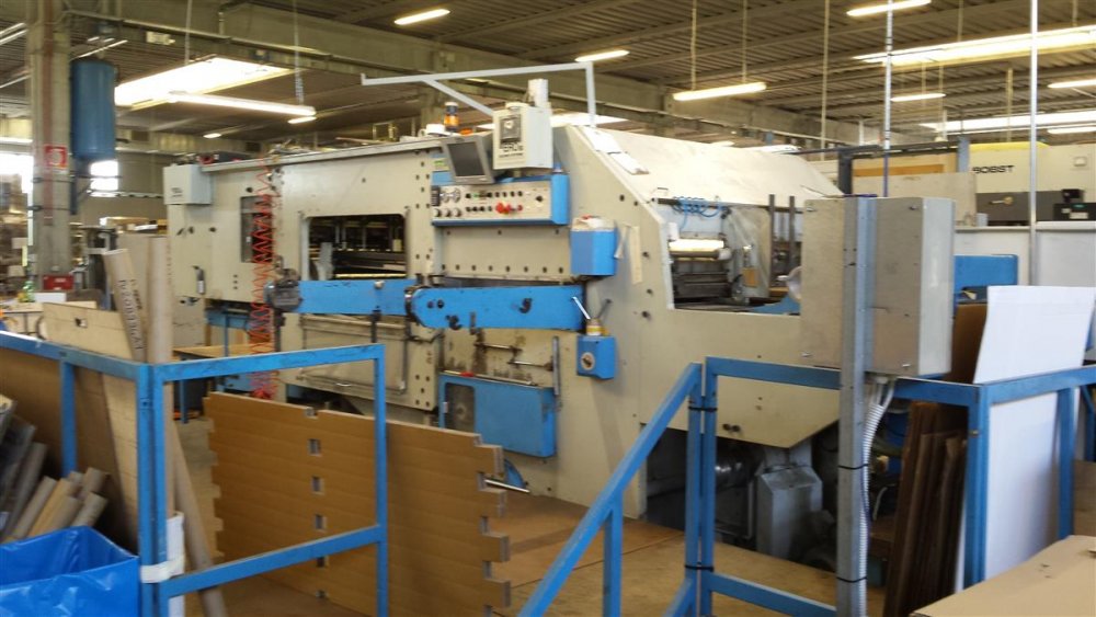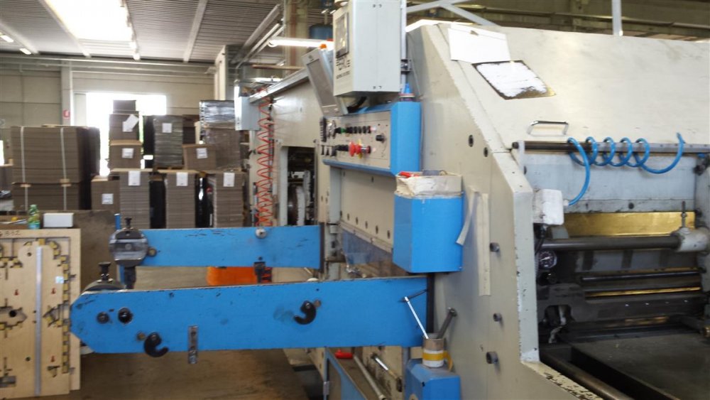 | Ulteriori informazioni | year 2000, perfect condition, official assitence by TMZ Spain,. Available March 2017, possible vision in production. Max size 1100mm x 1710mm Min size 500mm x 560mm Weight Max 1450gr\mq Weight Min 380gr\mq Speed 6000 sheeets\h Tonn 380. Thickness Max 8 mm Thickness Min 1 mm introduction with vacuum from bellow. Centerline 1 and 2 station. height 2550mm length 7170 mm width 4500mm weight 35 Ton included roller conveyors , Lift ,and ERO system for gluing inside the box |