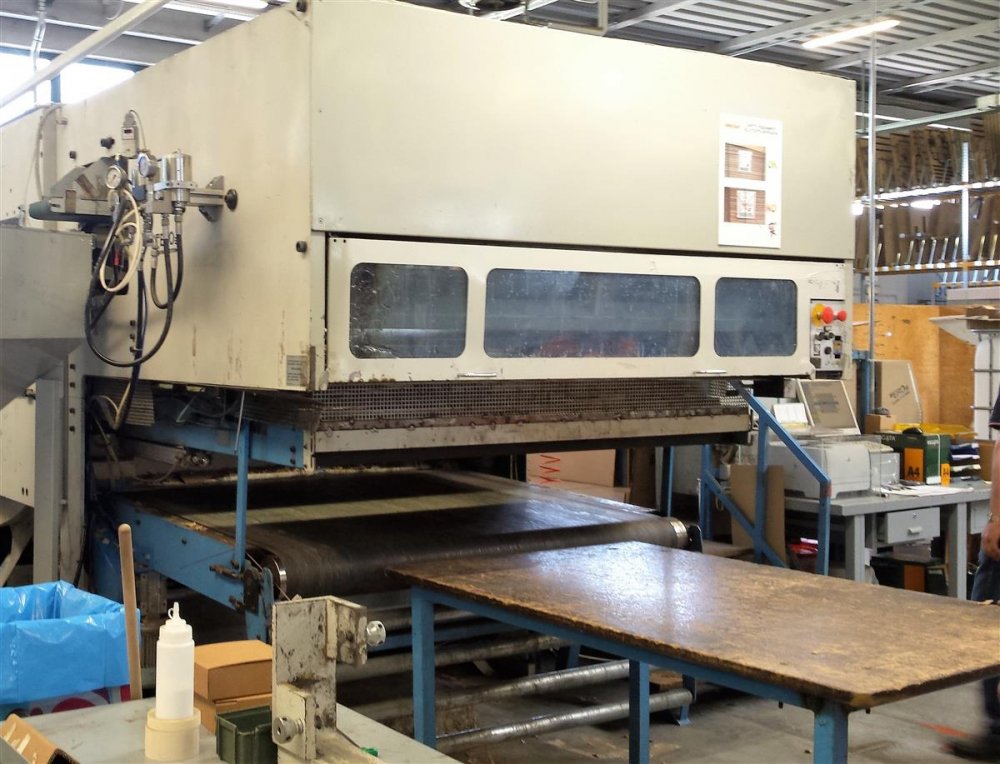 - year 2000, perfect condition, official assitence by TMZ Spain,. Available March 2017, possible vision in production. Max size 1100mm x 1710mm Min size 500mm x 560mm Weight Max 1450gr\mq Weight Min 380gr\mq Speed 6000 sheeets\h Tonn 380. Thickness Max 8 mm Thickness Min 1 mm introduction with vacuum from bellow. Centerline 1 and 2 station. height 2550mm length 7170 mm width 4500mm weight 35 Ton included roller conveyors , Lift ,and ERO system for gluing inside the box