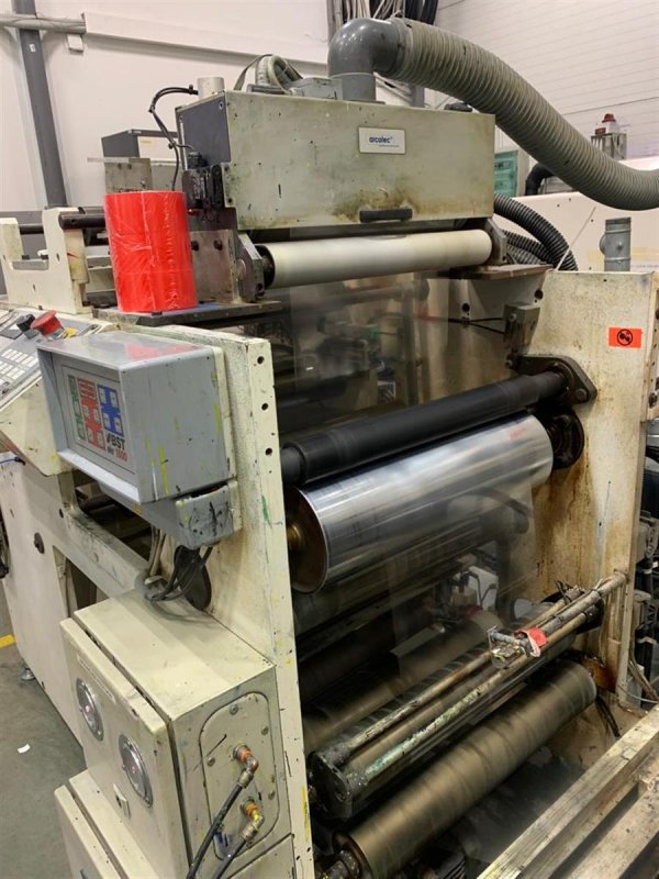 - Introduction + hot air – 60KW +120kW 400V 50Hz 3ph Compressed air – 6bar. 400l/min The standard unit was with 7 section, 2 additional sections were added to the unit, and now it is 9 sections. Old UV lamps have been replaced with E2C UV lamps. Material 12mkm film / 600 mkm cardboard Max speed 150 m/min Air pressure 6 bar Printing register adjustment 360 Maximum print width 405 mm Maximum die cutting width 405 mm Maximum die cutting repeat min 304,8 mm / max 609,6 mm Unwinder spindle diameter 76,2 mm Rewinder spindle diameter 2 shaft 76,2 mm Unwinder diameter 1000 mm Vacuum system, double side web cleaner 1psc One side corona treatment 1 psc UV curing system: single lamp UV GEW E2C system Hot air drying system: possibility only unit no 6 and no 9 Kit for reverse printing. Including enclosed chamber doctor blade and peristatic pump: Possibility unit no 8 Water cooling drums after each printing unit: chiller not included Possibility UV laminating: unit no 8 Motorized video camera EL scan Set of antistatic bars Web breake sensor 1 psc Servo driven mandrel for printing sleeves Printing preasure adjusment on 4 independent points Register adjustment is possible on every deck or at product Operator interface through touch screen panel Plate speed correction +- 2 % (slipping ) Inks pan with rubbel roll 12 psc Web turn bar Slitting unit Spare parts, accessories, technical documentation included l L/CM 60 DEGREES VOLUME CM3/M3 PSC 460 2,9 3 410 4 3 320 5 3 320 4 Twinflo reverse 1 psc 200 6,5 2 180 7,7 1 160 10 1 140 8,7 3