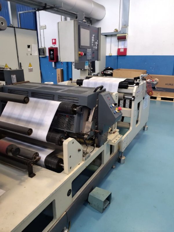 | Note | Printing possibility - 8 colors +1 rotogravure printing unit -8 Flexo printing group, complete with drum, removable ink drawer - 1 Rotogravure printing group, specific for front side printing, complete with turning bar for back side printing for cold seal coating "PETROCOLL" 1265, from 2.8 to 3.2 gr/mq. at a maximum speed of 180 m/1 on paper Plate mounter Slitter Bimec, width 1200mm 1 Corona treatment 1 Paper cleaner with single-sided contact roller mod. ACE 1 Scrap removal station limit 530 mm 1 Viscometer for solvent inks 1 Ink supply pump and tank 1 Omet electronic register control for 8-color machine, complete with "gate" function. 1 "Vision 1" vision system 1 E+L Elscan motorized video camera 1 Cold foil group handling trolley 1 Sliding cold foil group that can be positioned in each group (no rails) 1 Longitudinal scissor cut, for Varyflex 6 Knife and counter knife for self-sharpening box cutting, Helios |