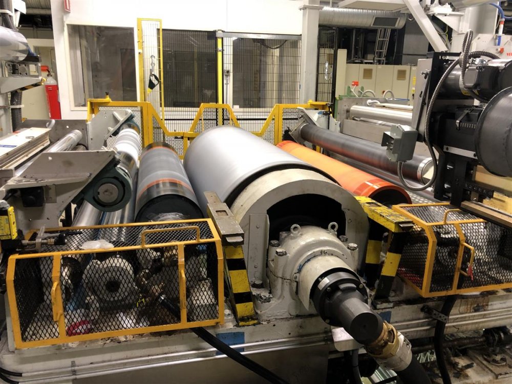 - UPGRADES AND OVERHAULS: -Winder new in year 2015 - Controls upgraded year 2008, currently machine is PLC SIEMENS S7, dirves renovated with ABB inverters, Siemens Sinamics inverters and Eurotherm digital DC drives, Siemens HMI -Mechaical overhauls -Cloren automati extrusion die year 2014 (recently cleaned) -Spare cloren die year 2008 -Thickness control Themorficher year 2014 with 2 readng heads -Dosing and material feeding system year 2006 FILM THICKNESS CONTROLL SYSTEM: - Make Thermofischer - Year 2014 - Double gauge (o 1 frame) Beta ray system and infra red. SPARE PARTS: Extensive ste of spares. Among which including also: - Automatic extrusion head Cloren with internal deckling - 3 x chill rollers (2 with mat finish, 1 with gloss finish) All with new finish - 4 new nip rollers for second ECL unit - banana roller - cooling roller - Other 4 new + 3 used rollers - 1x vetafone unit - pneumatic pipe’s roller for first ECL unit - contact woller (for winder) - set of new gears to change rpm ratios on extruder’s gearbox - 4x rotary joints - several new and used heaters for extruders - 2 new double fans for extruder’s cooling - sets of roller bearings (for calander) - second extrusion die’s feedblock cassettes for structures: ABA, AAB, BAA, AAA, BBB - several melt temperature and preassure gauges - several spares for die, including several spare thermo cylinders - new motors - 2 new Siemens Simoreg DC drives - Spares for carrige, e.g.: wheels, chain for pipes - Several new and used pnaumetic pistons used in different parts og the line (including ECL units and winders - several rollers
