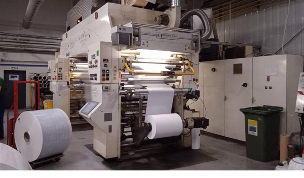 - Machine is equipped with one rotogravure coating trolley, one solventless coating trolley and one trolley dedicated for "cold seal" application. Register control for "cold seal" application, Pumping and mixing unit for mono and bi-component adhesives, 2 edge guide control, Drying tunnel 6 meters log Corona treater Machine is equipped with AC drives with suitable inverter controllers, Operator panel with touch screen