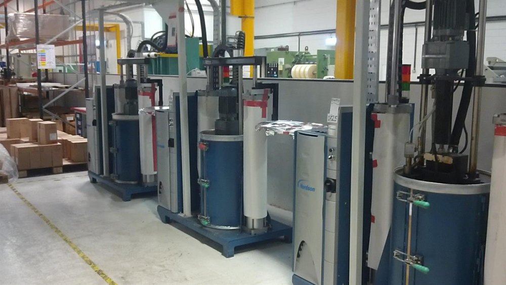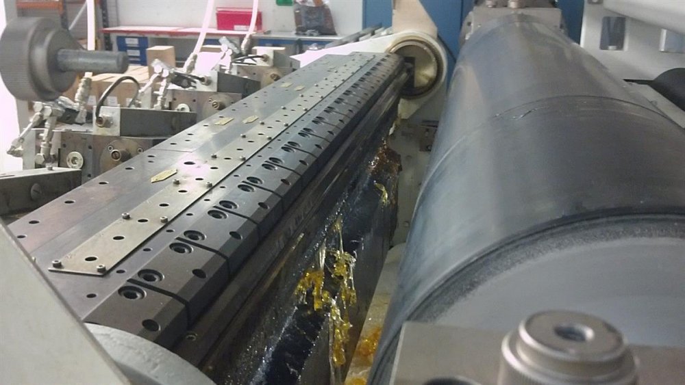 - Slot die coating head with Nordson adhesive system, Coating head, 2x cooling drums (water) 290mm diameter for the uncoated side of the web, Spreader roller, 1x trolley for nozzle change support , Max flow rate of coating head 550kg/hour