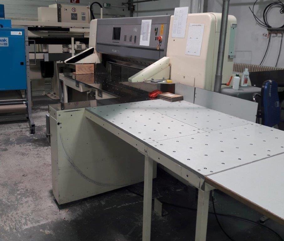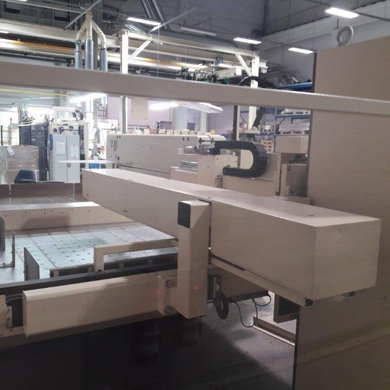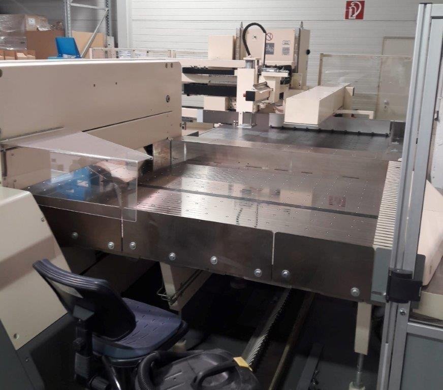 | Note | - working depth 202,5 cm - transfer width between backside table and Transomat is 176 cm - with ED controller - left side pneumatic lowerable side bar - pneumatic lowerable stainless steel transfer corner on the right air table -approx 12 knifes Left-sided loading Transomat mit clamb gripper and slider for back table batching Polar TR 185-BL-7 |