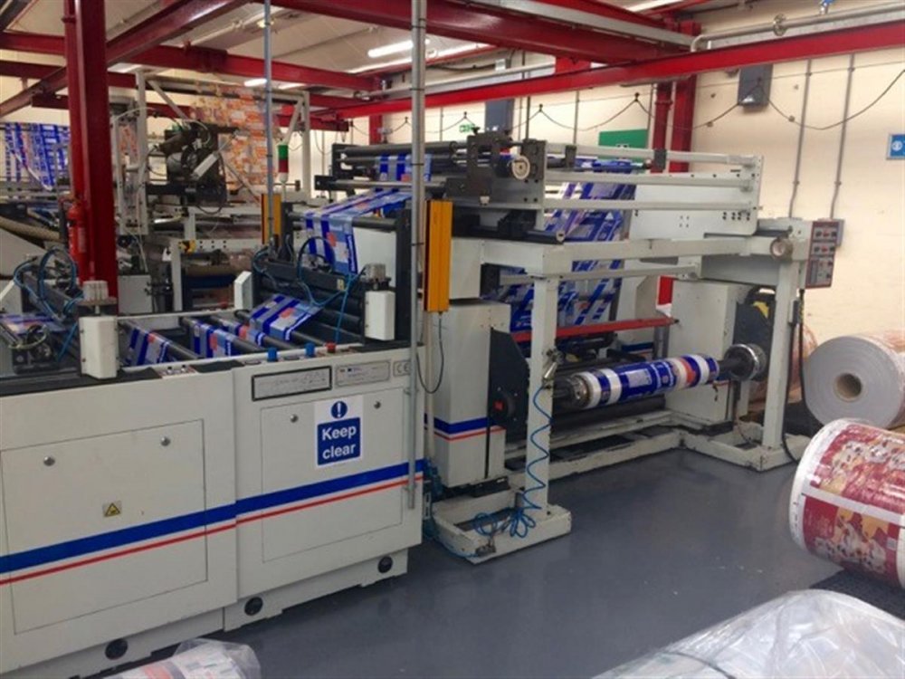 | Note | Web guider with edge sensor. Rear nip rollers and dancer roll unit. Bottom gusseting wheel. Photocell. Light guard system. Servo drive system. Static eliminator bars. Main draw rollers with stripper fingers. Side weld sealing head with top & bottom heating. Windmill wicketting drum with 6 sets of arms. Vacuum pump for windmill arms. Indexing stacking track conveyor. Electrical cabinet with digital display. Spare sealing head for different profiles. |