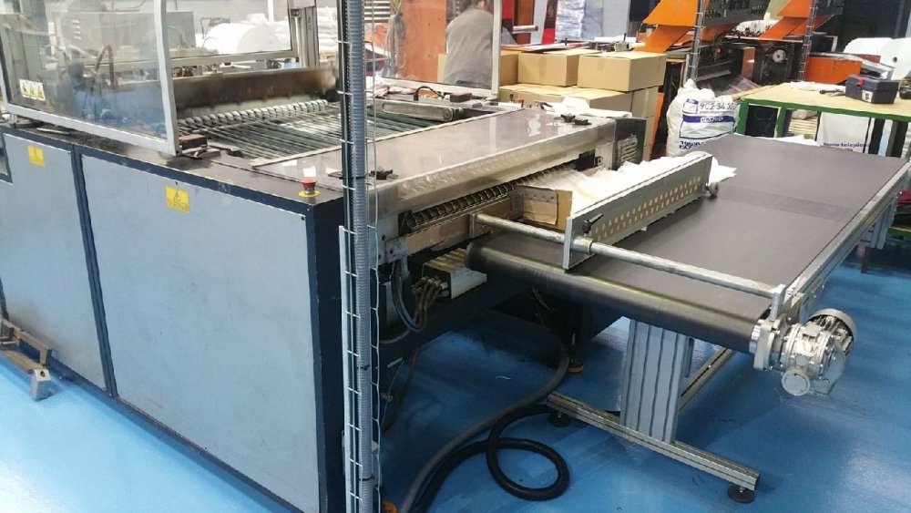 - attenzione 24-07-25 macchina smontata Flexo-loop bags w/wo bottom gusset Flexo-loop bags with reinforcement turn-up w/wo bottom gusset Die cut handle bags Die cut handle bags with reinforcement turn-up Material that can be processed:LDPE,HDPE, and recycled extracts Max welding width: Up to 850 mm Sealing width (bag length): 250-800mm Draw length (bag width): 250-800 mm Handle width: 30mm loop thickness:180-230 micron Driving system: PLC controlled Operator interface terminal Print registration control Servo motor driven input nip rollers 2 sealing bars, 1 for side and 1 for bottom seal