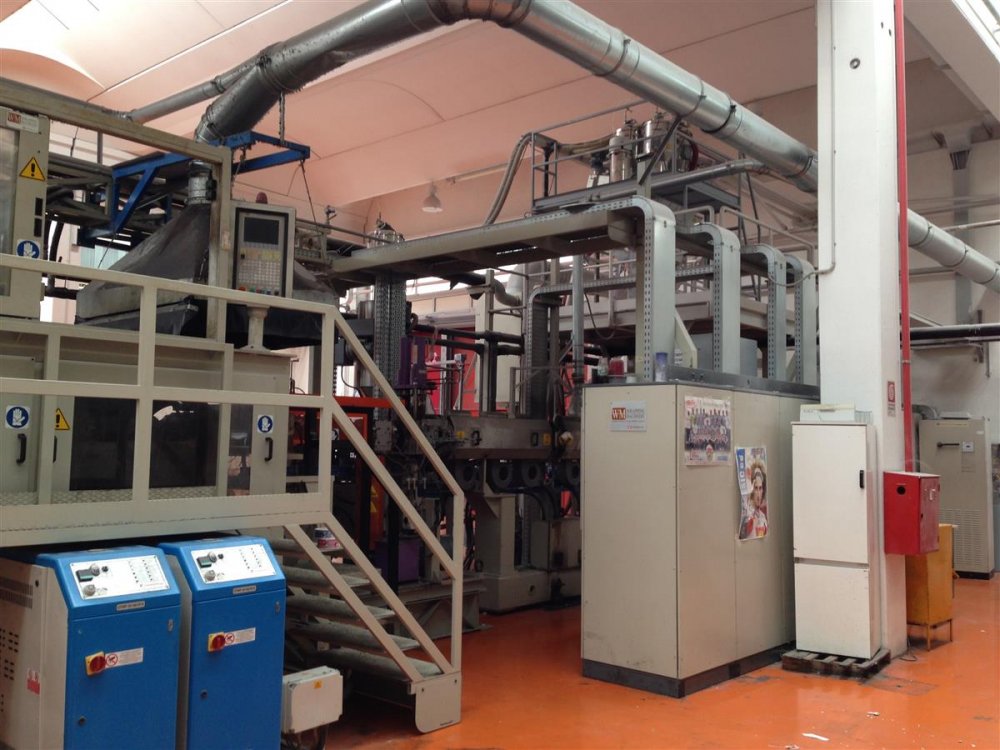 | Note | Complete line for plastic disposable plates . Gravimetric dosing system make Piovan Model MDW1000/42 at 7 components, complete with automatic resin vacuum loaders and blowers. Extrusion and Thermoforming machine for disposable plastic plates. Make WM Wrapping machinery SA (Switzerland ) . 3 layers. Structure ABA . Material HIPS ; PS . Sheet width 1050mm . Output 800kg/h . Plates/h 35.500 pcs/h (depending on mould) . Extruder B (main) : screw diameter 120mm; degassing pump; hydraulic screen changer type continous, make Maag , Melt pump . Extruder A (skin) screw diameter 50mm, degassing pump, hydraulic screen changer make Maag Thermocalender C1160 . Thermoforming machine Intec 1000. Max forming tool area 1000x1000. Forming system : vacuum.Clamping device 40.000daN . Integrated in mould trimming system Extraction system electric type Thermoregulation unit Intec 1000/2 Thermoregulation unit for calenders Chiller I214000 Kcal/h Scrap re-feeding system complete with grinder Moulds : 1 x 16 plates 220mm ; 1x 16 plates 220mm Automatic packaging machine for disposable plates. Packaging of plates in bags. packaging of bags into boxes. Make Selematic, complete with conveyor belt. Complete compressed air system unit. Capacity 73,6 MC/min, pressure 8,5 bar. Complete with compressors, drying, separation and tank |