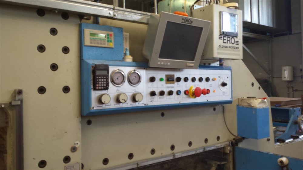 year 2000, perfect condition, official assitence by TMZ Spain,. Available March 2017, possible vision in production. Max size 1100mm x 1710mm Min size 500mm x 560mm Weight Max 1450gr\mq Weight Min 380gr\mq Speed 6000 sheeets\h Tonn 380. Thickness Max 8 mm Thickness Min 1 mm introduction with vacuum from bellow. Centerline 1 and 2 station. height 2550mm length 7170 mm width 4500mm weight 35 Ton included roller conveyors , Lift ,and ERO system for gluing inside the box